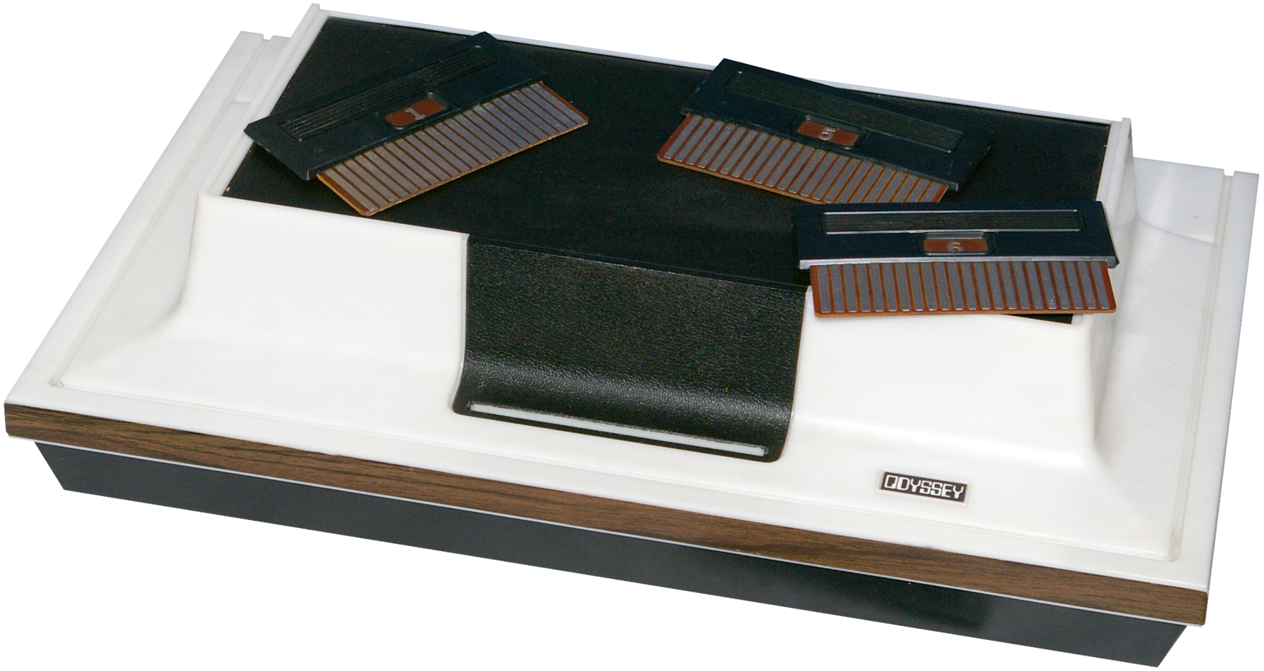Description: The first video game console released in 1972 and designed by illuminary Ralph Baer. The system accepted cartridges but was not a rom based system, instead using crossed links on the cardridges circuit boards to modify the base game.